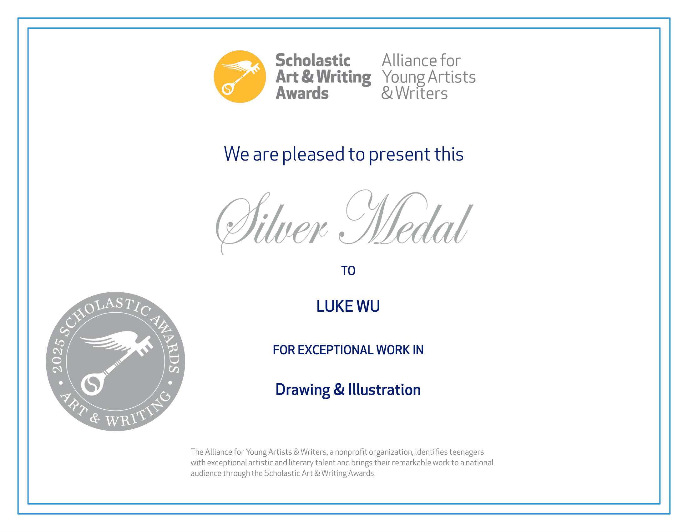Awards & Certificates I am grateful for the recognition my art has received, and I’m happy to share these awards with you. 2025 National Award Golden Keys Silver Key Awards Honorable Mentions Publication Certificate Autodesk Certificates Contact lwu8258@gmail.com Policies Terms of Service Subscribe Success! Email Enroll